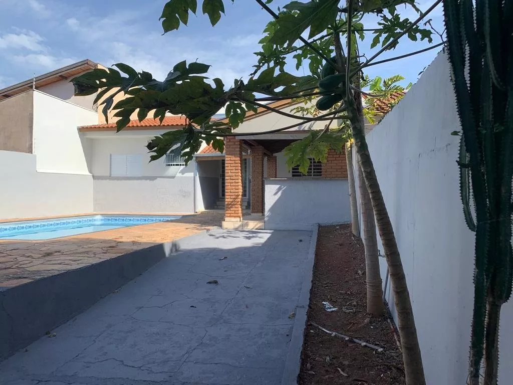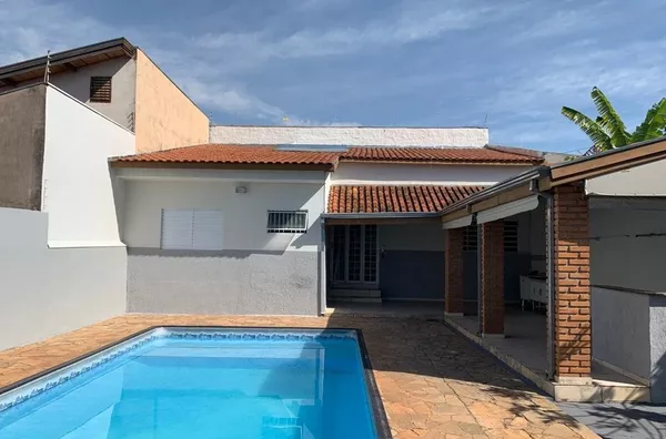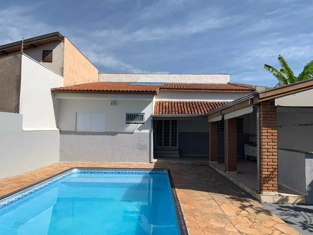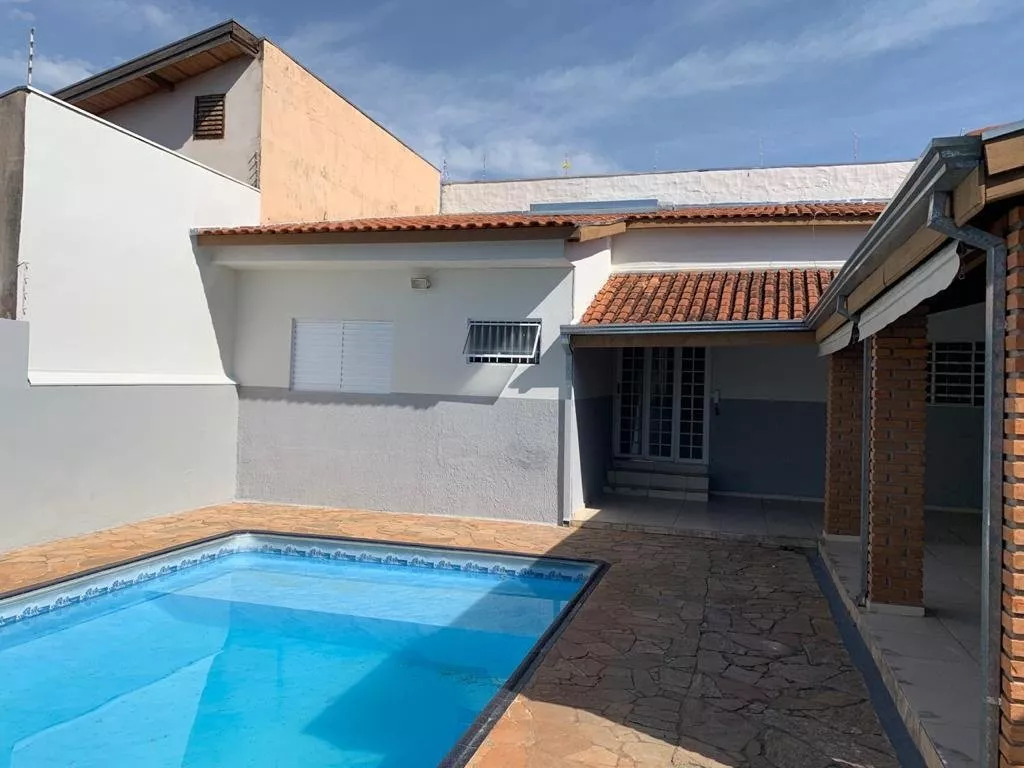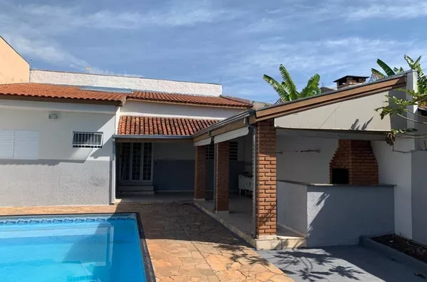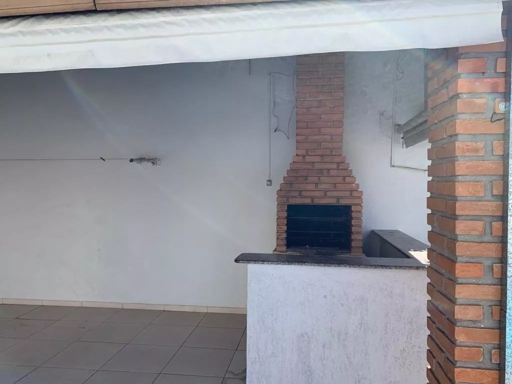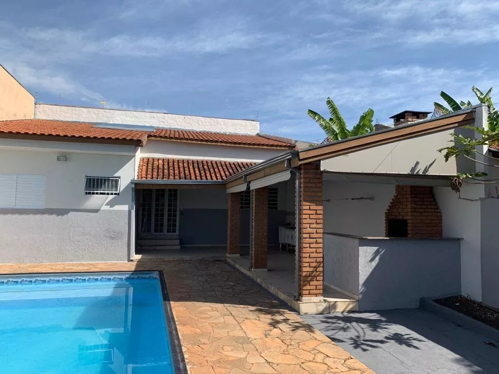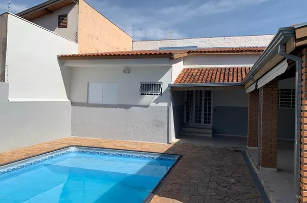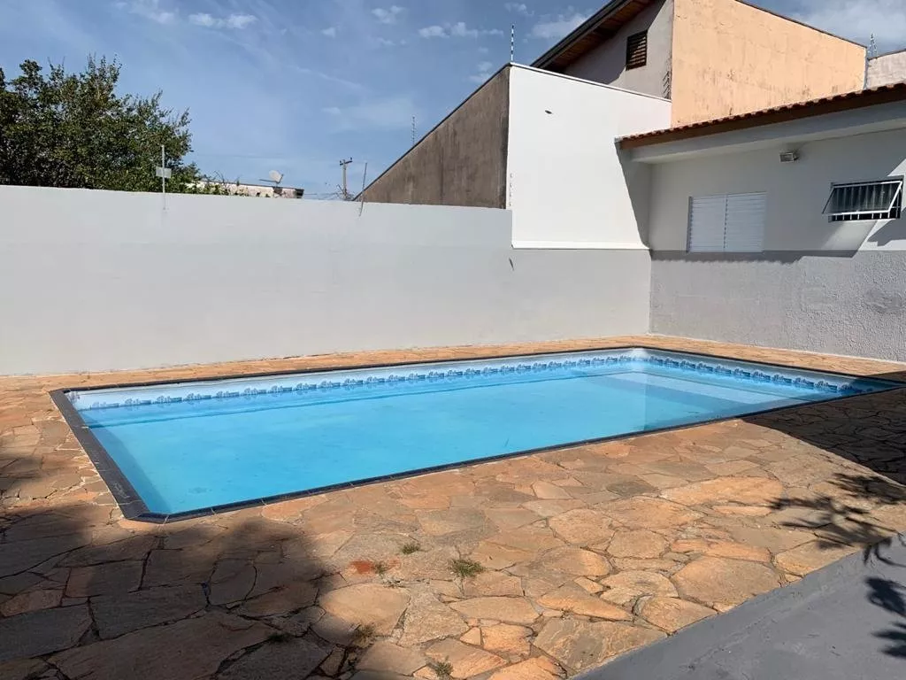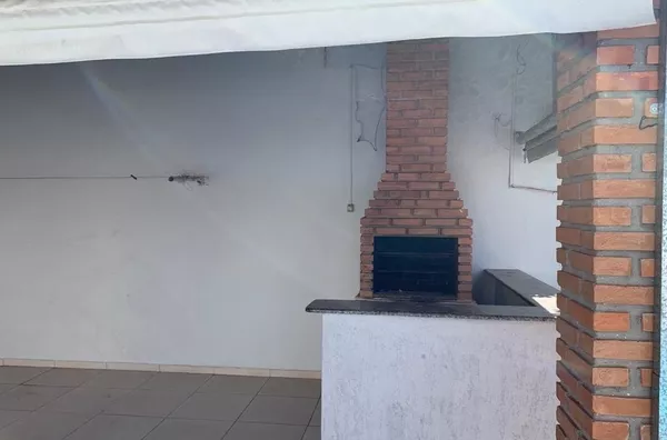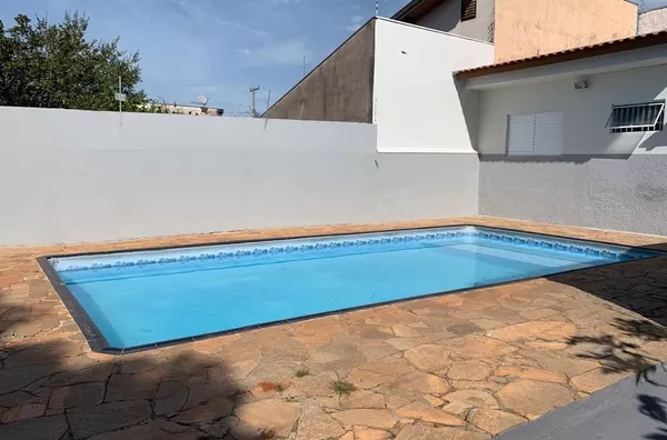 Área de lazer com piscina e churrasqueira.